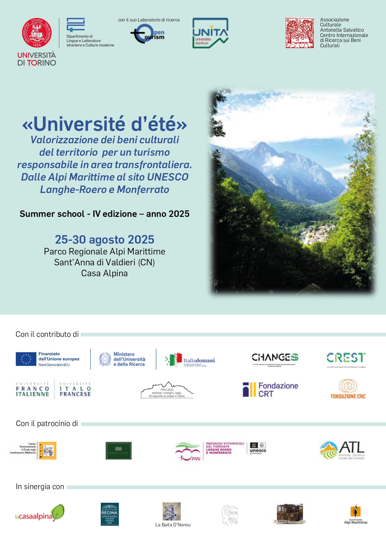 Articolato in tre sessioni tematiche, il convegno si configura come contrappunto dell’iniziativa “Université d’été”. Valorizzazione dei beni culturali del territorio per un turismo responsabile in area transfrontaliera. Dalle Alpi Marittime al sito UNESCO Langhe-Roero e Monferrato, corso residenziale estivo svoltosi a Sant’Anna di Valdieri (CN) dal 26 al 31 agosto 2024.